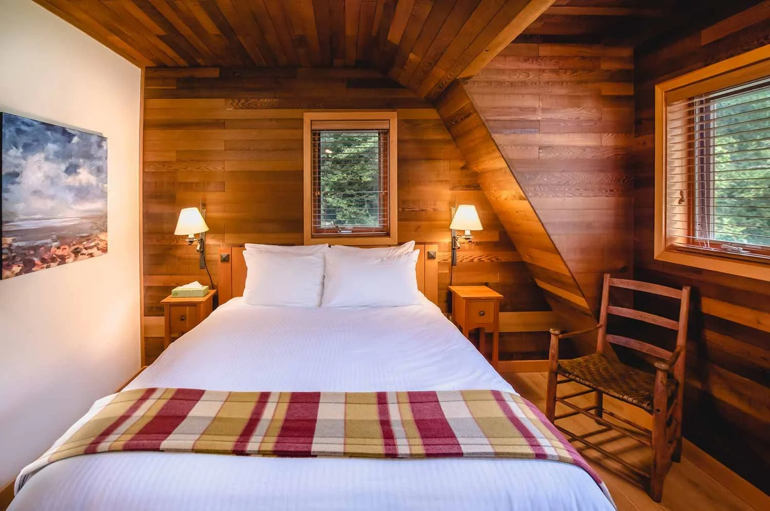 The historic main lodge sits at the centre of retreat life, overlooking the gardens and gathering spaces. Upstairs, five cozy and character-rich rooms offer queen beds and private baths—blending rustic charm with quiet comfort. You’re just steps away from the dining room and the fireplace lounge, perfect for a peaceful morning coffee or a relaxed wind-down at the end of the day.