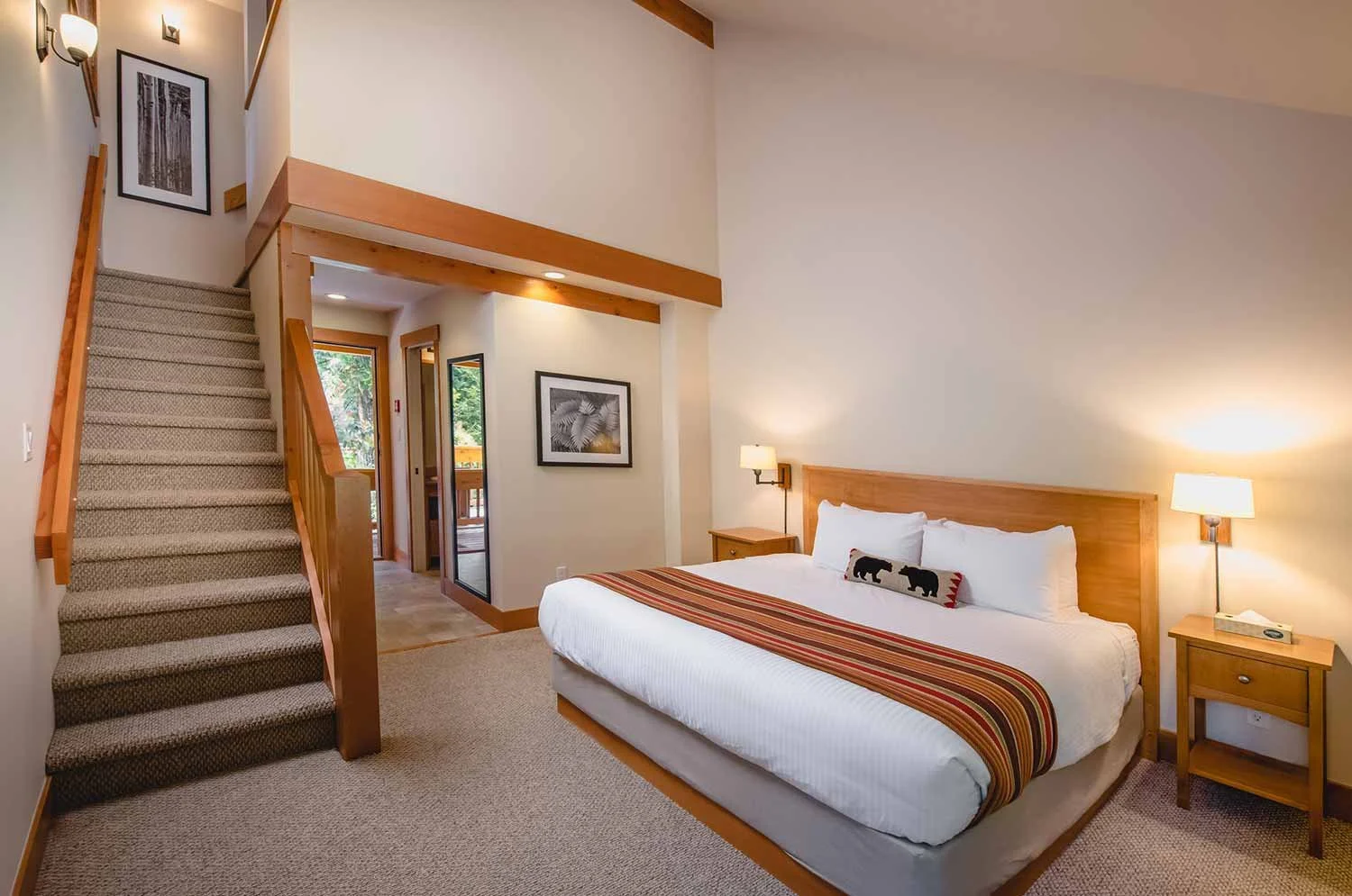 Tucked into the forest, these airy loft-style suites offer modern, spacious comfort. Each features a ground-floor bedroom with a king bed and full bathroom, plus an upper loft with a double bed—ideal for participants sharing accommodations while still enjoying their own private spaces.